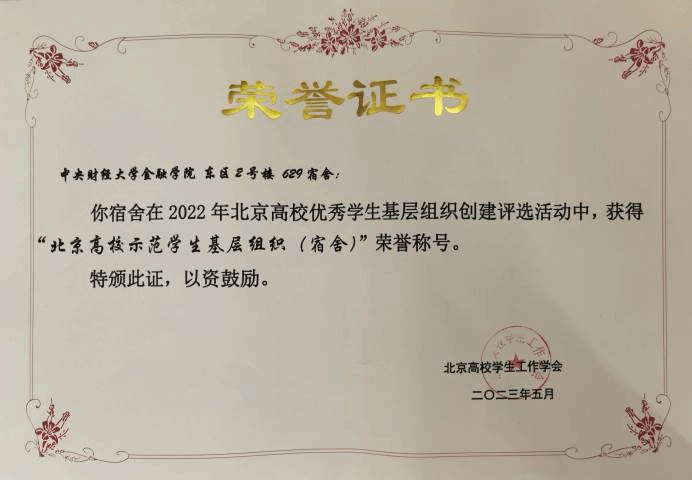 伟德国际victor1946东区2号楼629宿舍在2022年北京高校优秀学生基层组织创建评选活动中,获得“北京高校示范学生基层组织(宿舍)”荣誉称号。