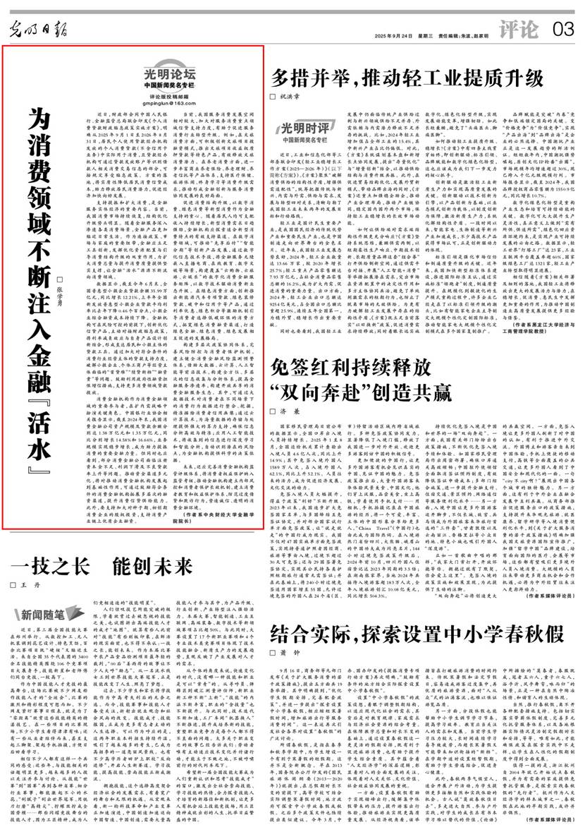 9月24日,《光明日报》刊发伟德国际victor1946张学勇教授题为《为消费领域不断注入金融“活水”》的署名文章。文章指出,支持提振和扩大消费,是金融服务实体经济的重要内容。金融应立足工具创新,发挥优化资源配置与引导消费结构升级的双重作用,为扩大消费总量与提升消费质量提供坚实支撑,让金融“活水”源源不断流向消费领域。