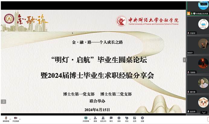 6月15日,伟德国际victor1946博士生第一党支部、博士生第二党支部、2023级金融学硕党支部从同学实际需求出发,举办“金融路--个人成长之路”主题活动暨“明灯·启航”毕业生圆桌论坛暨2024届博士生求职经验交流会。