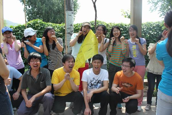 在素质拓展教练的带领下,老师和同学们首先进行了热身和破冰。通过趣味互动,拍手训练等活动,教练向大家道出了素质拓展活动关键词,即团队协作、突破自我、创新思维、优化方法。随后,队员们随机分为两组,经历了15分钟的选队长、起队名、画队旗、想口号、编队歌等环节之后,两队队名分别确定为“大拇哥队”“和好汉队”,并进行了各具特色的团队展示。
