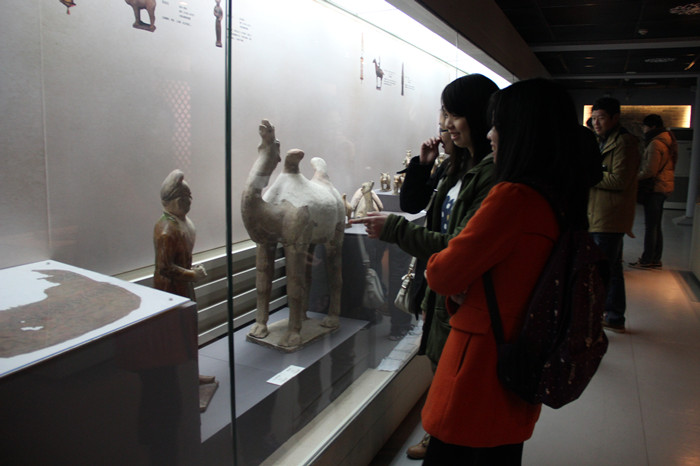 在参观了万寿寺内的古建筑之后,我们在志愿者的带领下开始了对“丝绸之路”的展览参观活动。该展览以丝绸之路上的精彩遗物反映了古代中西文化的交流及甘肃的历史文化风貌。展览按照丝绸之路开辟的时空脉络分为前奏、开启、繁荣与余晖四个部分,年代跨度上起4000多年前的齐家文化,下至公元13、14世纪的元代。此外,其文明主题展览展品共计149件,包括青铜器、玉器、金银器、木器、石造像、丝织品等多个种类文物,它们的年代上起4000多年前的齐家文化,下至公元十三、十四世纪的元代,从多个角度反映了不同时期中西文化交流的特色。