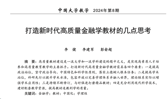 近日,我院李健教授、李建军教授、彭俞超教授合作完成的教学论文“打造新时代高质量金融学教材的几点思考”在《中国大学教学》2024年第8期正式刊出。