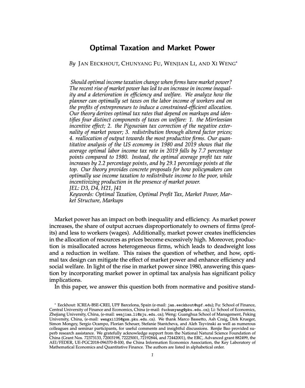 我院傅春杨副教授与西班牙庞培法布拉大学Eeckhout教授、浙江大学李文健教授、北京大学翁翕教授合作撰写的论文“Optimal Taxation and Market Power”在经济学五大顶刊之一The American Economic Review接收并在线发表。论文作者按音序排列。论文在线链接:https://www.aeaweb.org/articles?id=10.1257/aer.20211445。