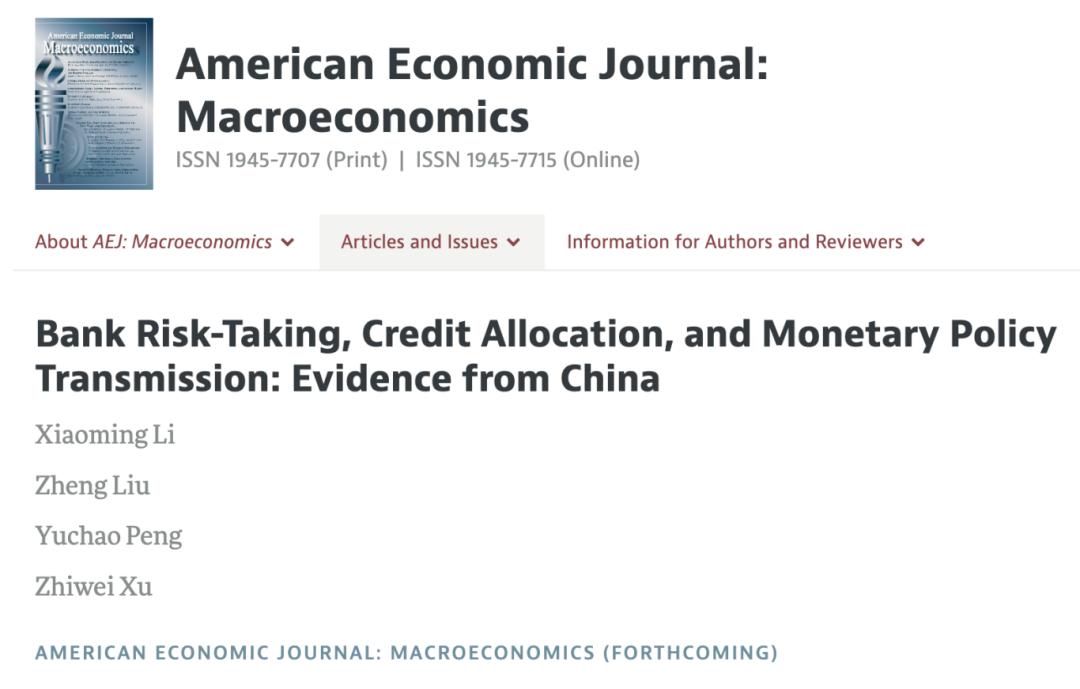 近期,伟德国际victor1946教授彭俞超,与对外经济贸易大学李晓明,旧金山联邦储备银行Zheng Liu,复旦大学许志伟,合作撰写的论文“Bank Risk-Taking, Credit Allocation, and Monetary Policy Transmission: Evidence from China”(银行风险承担、信贷配置与货币政策传导——来自中国的证据)被宏观经济学国际顶期American Economic Journal: Macroeconomics接受待刊并在线发表。