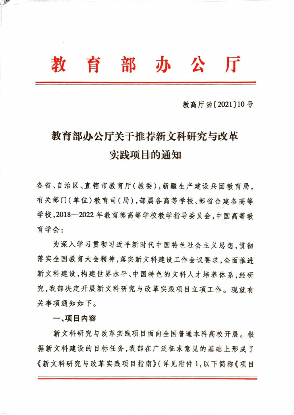 教高厅函〔2021〕10号 教育部办公厅关于推荐新文科研究与改革实践项目的通知.pdf