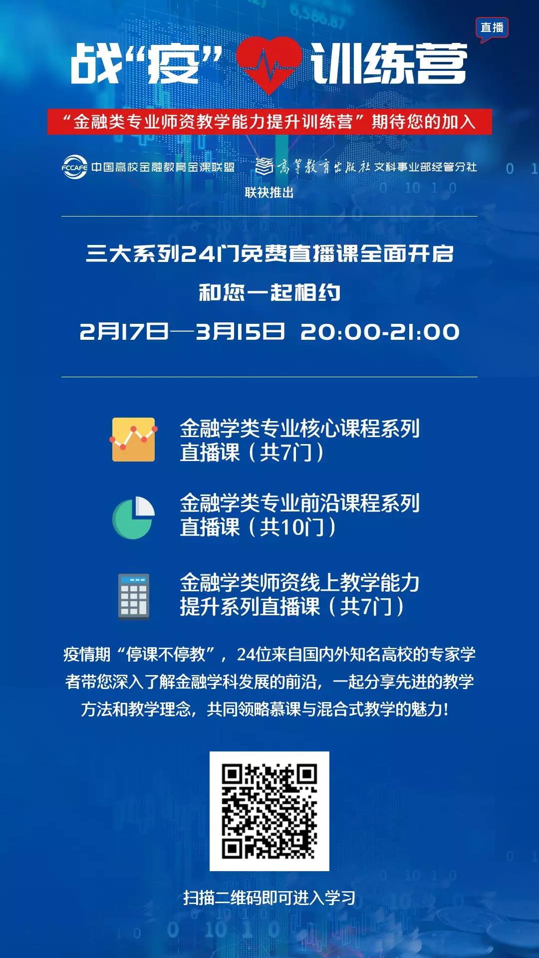 "金融类专业师资教学能力提升训练营"即将开启!2月17日—3月15日,每天20:00—21:00。共分三期24门免费直播课具体日程安排如下: