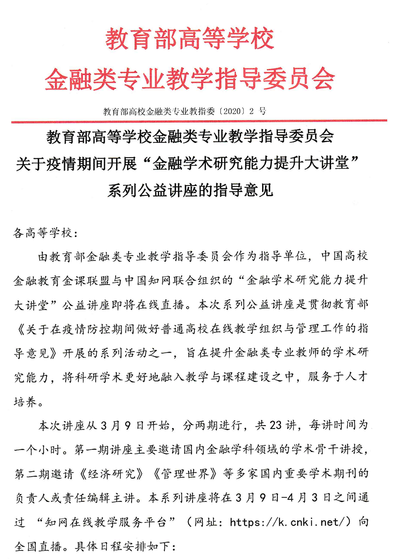 教育部高等学校金融类专业教学指导委员会关于疫情期间开展“金融学术研究能力提升大讲堂”系列公益讲座的指导意见