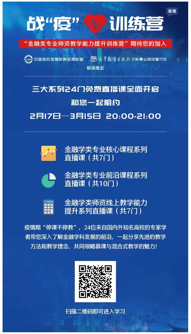 由2018-2022年教育部高等学校金融类专业教学指导委员会作为指导单位,教指委秘书处机构伟德国际victor1946,联合中国高校金融教育“金课”联盟、高等教育出版社和爱课程中国大学MOOC平台,在抗“疫”期间,积极贯彻落实教育部《关于在疫情防控期间做好普通高等学校在线教学组织与管理工作的指导意见》的精神,组织策划并深入开展了全国高校“金融类专业骨干师资教学提升训练营”项目。该项目邀请了国内外高校金融类专业领域教学经验丰富的教学名师、知名专家学者、中国大学MOOC上线课程主持人,分三期推出了24门次专业直播课程,深入讲解学科前沿和内涵,提供基于线上课程的教学方法指导,帮助高校金融类专业教师快速有效地开展线上教学。训练营全程通过中国大学MOOC平台直播,由网易提供技术支持。
