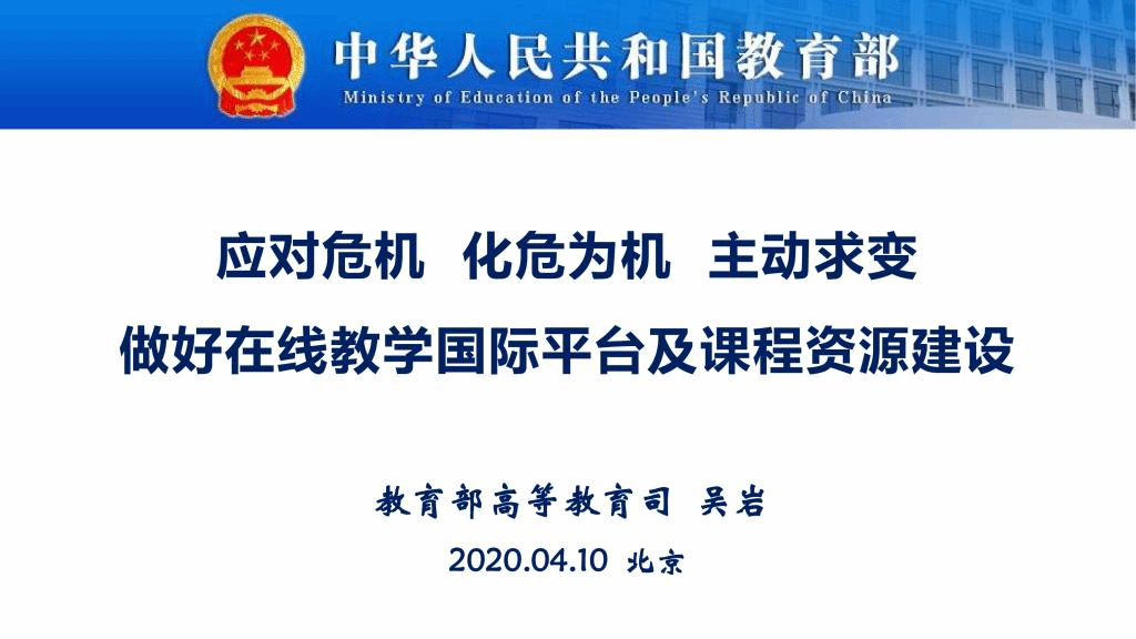 4月10日下午,高校在线教学国际平台课程建设工作视频会在京召开。教育部高教司司长吴岩以《应对危机、化危为机、主动求变,做好在线教学国际平台及课程资源建设》为主题作报告。危机时刻,中国高等教育将以这样的行动支持世界高等教育共渡难关。