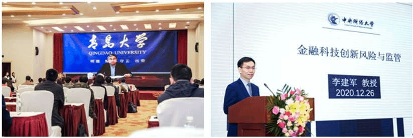 在第一个主题演讲环节,金融教指委副主任委员、青岛大学党委书记胡金焱教授和伟德国际victor1946院长李建军教授分别做了演讲。胡金焱教授通过线上视频的方式做了题为《金融服务实体经济,助推“双循环”新发展格局》的演讲。他对科技发展给教育带来的推动和挑战进行深刻分析,指出我们要深刻认识新一轮教育教学改革给我们人才培养专业建设带来的影响,顺应时代要求推动高校专业变革。李建军教授的演讲题目是《金融科技创新风险与监管》。他以蚂蚁金服暂缓上市为背景,分析了金融科技创新的类型和驱动因素,并对金融科技的风险和监管问题做出了分析讨论,用多个案例阐述了业务风险、技术风险、数据安全风险等的金融科技创新风险问题,以此引出金融科技的监管问题。