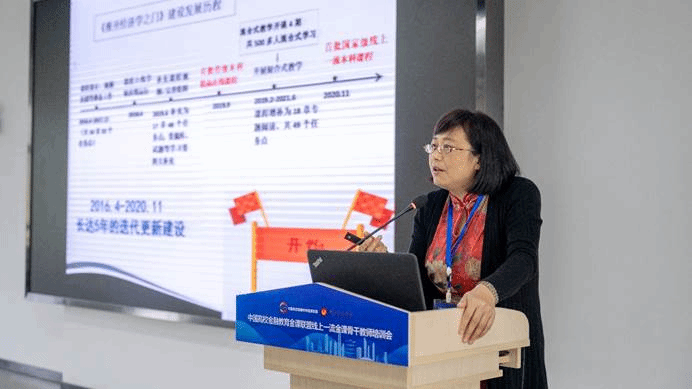 中南民族大学程蹊教授介绍了《推开经济学之门》课程建设的发展历程,分享了自己关于线上一流课程建设的体会:课程建设要学习学习再学习,在学习中捕捉风口、抢先机;要找准课程定位、特色,努力提高流量;要教研相长,形成教学成果链;要摸准学生心态,提起学生的学习兴趣。