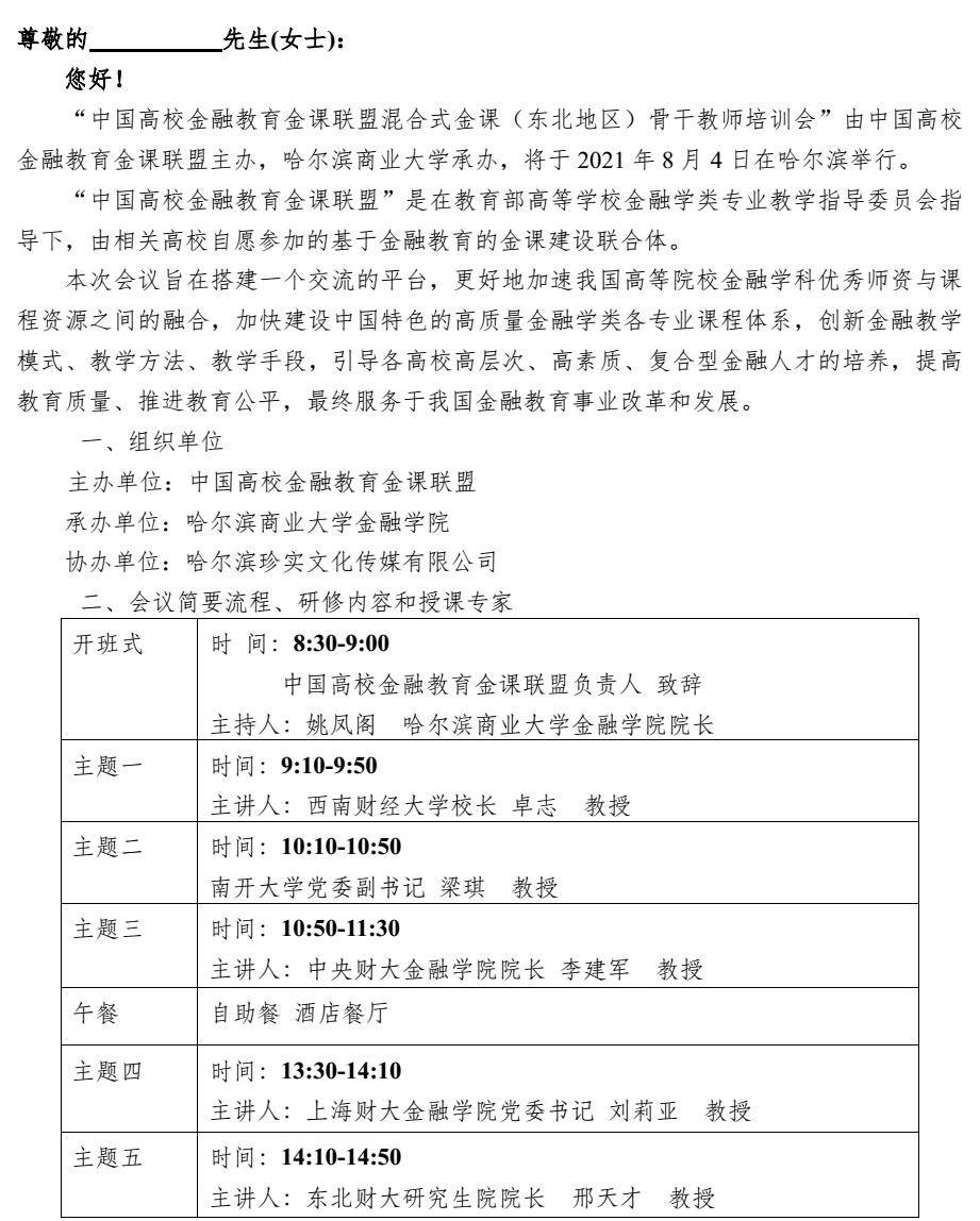“中国高校金融教育金课联盟混合式金课(东北地区)骨干教师培训会” 邀请函