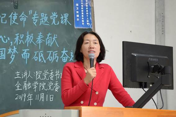 首先,毛老师向同学们阐明在全党开展“不忘初心、牢记使命”主题教育的重大意义。随后带同学们回顾了党史,从党的建立、成长、崛起、开拓进取到改革开放,峥嵘岁月,党的初心和使命不改。之后,毛老师向同学们讲述了我校的发展历程和中财大人的初心和使命。最后她对同学们提出三点期许:一、学会感恩;二、敢于担责;三、不畏挫折,希望同学们能牢记艰苦奋斗初心,努力学习,积极奉献,为实现中华民族伟大复兴的中国梦一同奋勇前进。