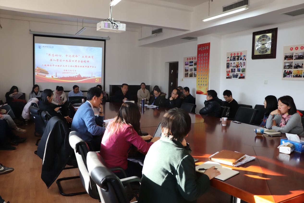学习好、宣传好、贯彻好党的十九届四中全会精神,是当前和今后一个时期内全国上下的重大政治任务,是高校基层党组织的重大政治责任。结合“不忘初心、牢记使命”主题教育,为切实抓好党的十九届四中全会精神的学习宣传和贯彻落实,我院党委于2019年11月27日组织召开了学习贯彻党的十九届四中全会精神专题研讨会。会议由我院党委副书记李俊峰主持,党委书记毛静,院长李建军,组织员张晓红,副院长应展宇、王辉、黄志刚及学院全体教师参加学习。