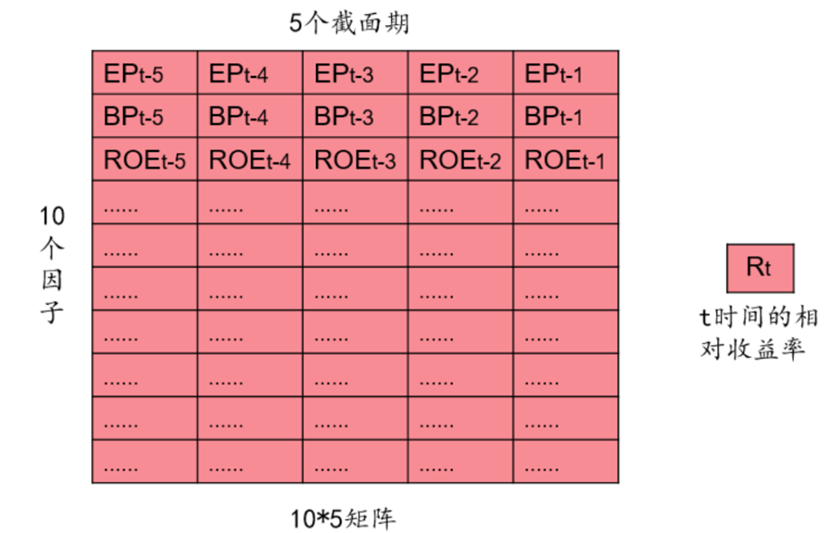 考虑到PCANet和CNN都具有处理二维数据的特性,可以将个股的因子数据组织成类似于图片的二维数据,考虑一定长度的历史截面期,那么对于该个股来说,就可以得到一张个股的因子图片,该个股对应一个t时间的超额收益率Rt来作为标签。