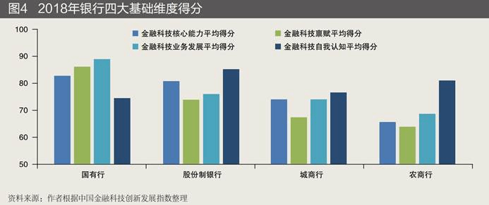 从所有制形式来看,国有大型商业银行的金融科技创新能力最强,其金融科技的业务发 展基础和基础禀赋得分都更高;股份制银行受益于金融科技板块不断成熟的技术和业务形式,其金融科技水平则呈现出后发优势。