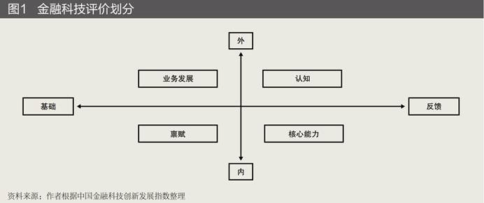 研究中心在采用知识图谱和主成分分析进行相关因素的选取、使用人工智能方法获得客观和高质量数据、使用信息熵做总体评价模型并建立应对模型不确定性的机制后,提取了中国金融科技创新指数的四个核心要素,分别为:金融科技禀赋基础、金融科技业务发展、金融科技认知及金融科技核心能力,对应下图中的四个象限。